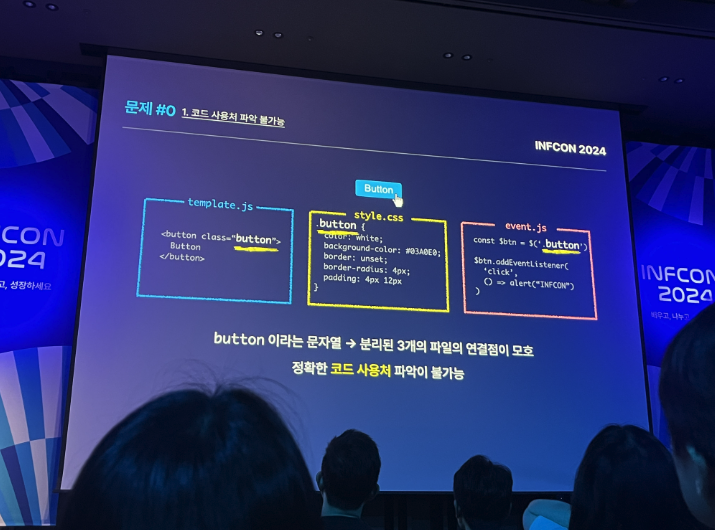 Button이라는 문자열 → 분리된 3개의 파일의 연결점이 모호함(template.js, style.css, event.js) ⇒ 정확한 코드 사용처 파악이 불가능