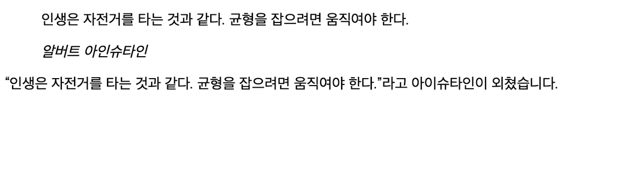 <p>인생은 자전거를 타는 것과 같다. 균형을 잡으려면 움직여야 한다.</p>