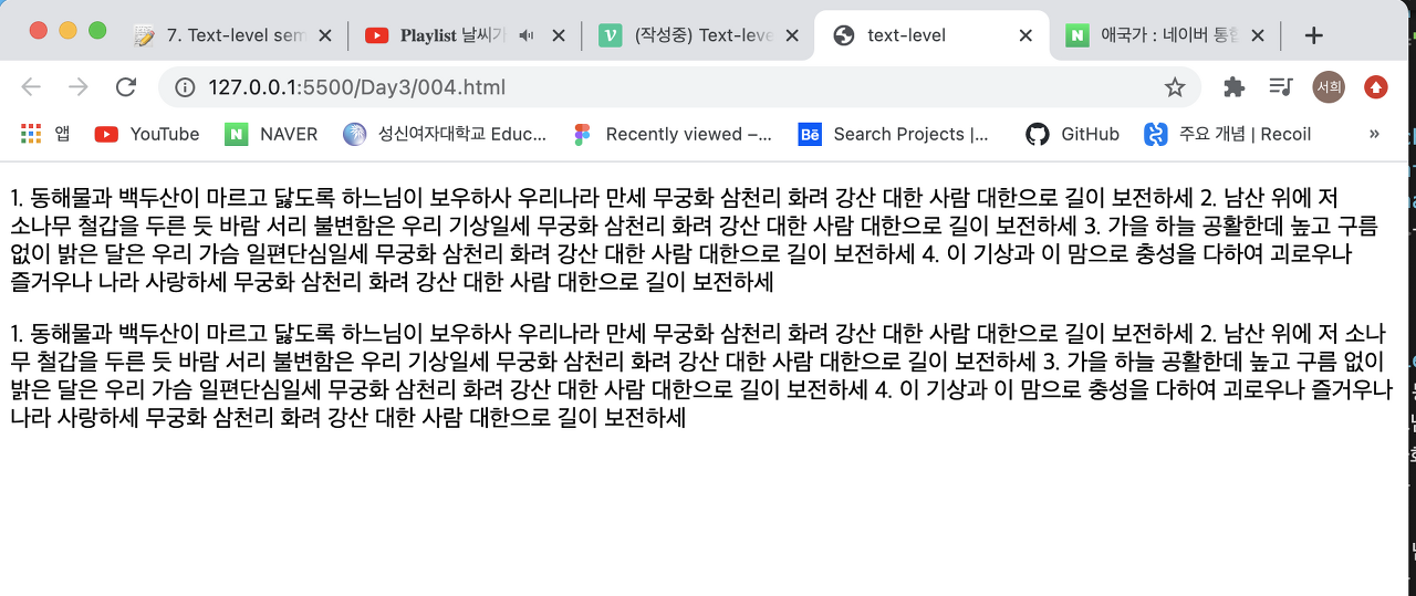 영어 단어일 때는 두가지 태그가 거의 차이가 없다. 하지만, 한글에 사용하게 되면 그 차이는 매우 크다. white-space : normal을 사용하게 되면 위 사진과 같이 소나무 철갑을 두른 듯~ 이 부분에서 소(다음 줄)나무 이렇게 단어 하나가 잘리게 된다.